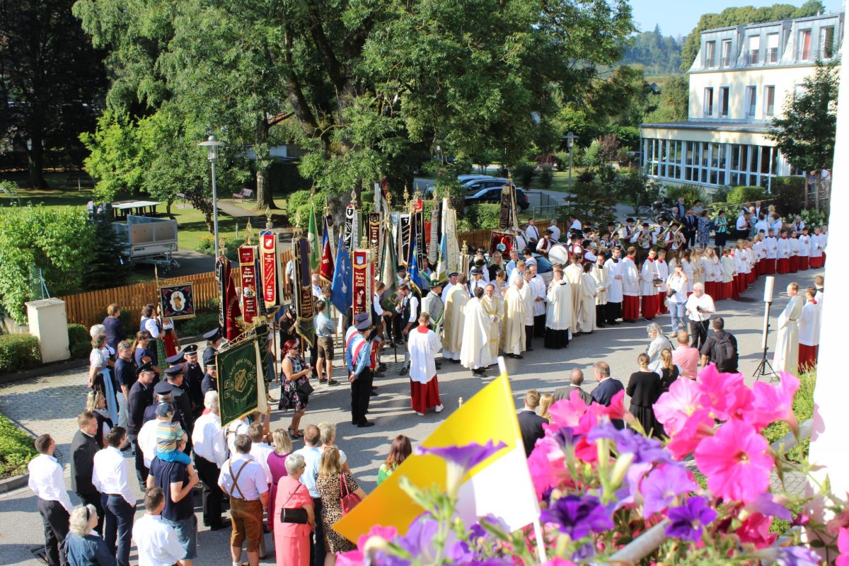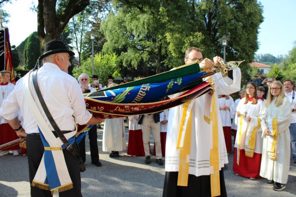 Dr. Florian Haider wurde am 30. Juni 2018 im Dom zu Passau von Bischof Dr. Stefan Oster zum Priester geweiht. Am 15. Juli feierte er in Kraiburg seine Primiz, also seine erste offiziell in der Gemeinde gehaltene feierliche Messe. Natürlich haben auch wir uns auf den großen Tag vorbereitet: Girlanden für den Eingang wurden gemeinsam mit den Bewohnern gebunden, Blüten gebastelt, Vasen mit Blumen in den Farben der Kirche in weiß gelb arrangiert. Viele Bewohner versammelten sich schon früh am Tag der Primiz im Wintergarten. Hier sprach der junge Geistliche zusammen mit den Anwesenden ein Gebet und spendete anschließend den heiß ersehnten Primizsegen. Schon früher galt dabei der Spruch: Für einen Primizsegen muss man sich die Schuhsohlen durchlaufen. Dabei kann man die Gewichtung einer solchen Handlung erahnen. Leider konnte der Primiziant nur kurze Zeit im Hause verweilen, denn auf dem Vorplatz fanden sich bereits die Blaskapelle, die Fahnenabordnungen, Ministranten aus dem gesamten Pfarrverband (64), Vertreter aus Kirche und Politik und viele Gläubige aus der näheren und weiteren Umgebung ein. Pfarrer Florian Haider segnete Erinnerungsbänder für die einzelnen Vereinsfahnen und schließlich überraschte ihn auch noch eine kleine Gruppe des Kindergartens mit einem Lied. Unser schön geschmücktes Haus bot dazu eine wunderschöne Kulisse. Alle machten sich schließlich in einem langen Zug auf den Weg zur Marktkirche St. Bartholomäus um dort gemeinsam den Gottesdienst zu feiern.