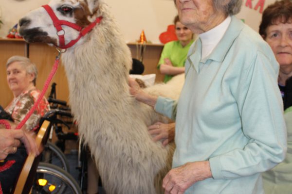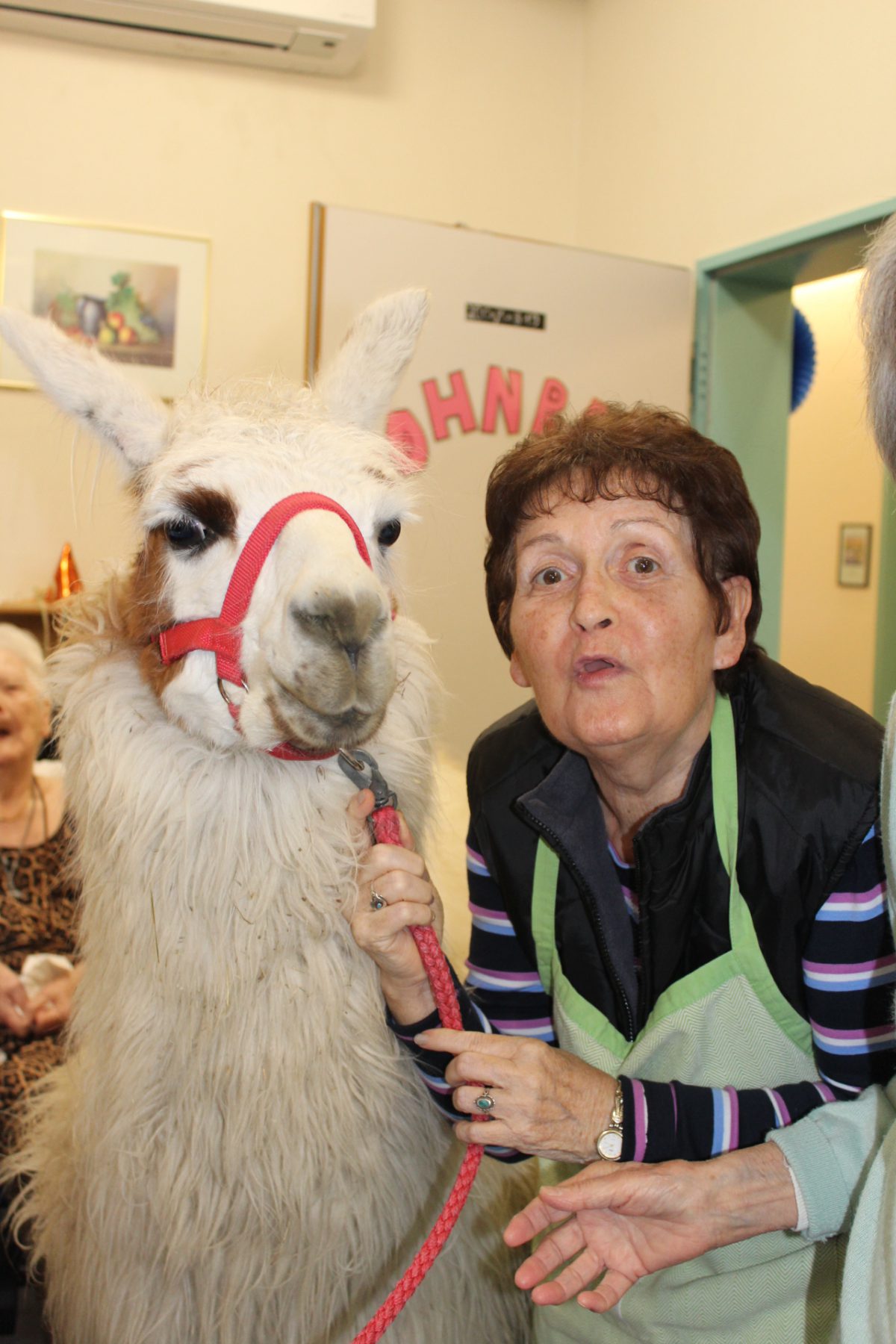 Voller Vorfreude warteten unsere BewohnerInnen auf den angekündigten Besuch: Ein Lama . Die Überraschung über diesen außergewöhnlichen Gast war jedem ins Gesicht geschrieben. Es stieg in den Aufzug ein und ließ sich bereitwillig streicheln, kraulen und liebkosen. Dabei blieb es die meiste Zeit ruhig am Platz stehen und beobachtete sein Umfeld. Da war natürlich die Freude groß. Gerne fasste man die Leine an und hatte für kurze Zeit einen treuen Begleiter an seiner Seite. Die Besitzerin, Frau Holzner, musste viele Fragen beantworten: Sein Name war Djego, er war 3 Jahre alt und seine Vorfahren stammen aus Südamerika. Die meisten waren so angetan von dem Lama, dass wir gleich den Termin für den nächsten Besuch vereinbart haben. Nach zwei Stunden Streicheln und Zureden hatte das Tier schließlich auch eine Pause verdient und durfte mit seiner Besitzerin wieder nachhause fahren. Wir freuen uns schon auf ein Wiedersehen.